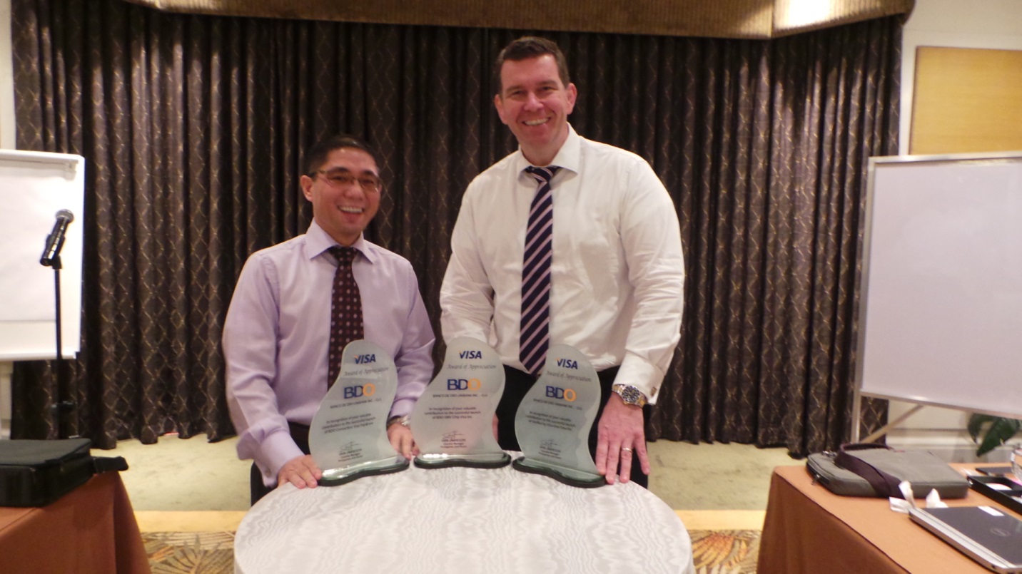 Rolando Tanchanco, BDO Executive Vice President and Consumer Lending Group Head and Visa Country Manager for the Philippines and Guam Iain Jamieson during the awarding ceremony for the launch of BDO Visa payWave.